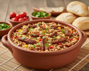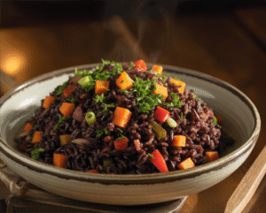 Risoto de Arroz Vermelho com Linguiça e Queijo de Coalho