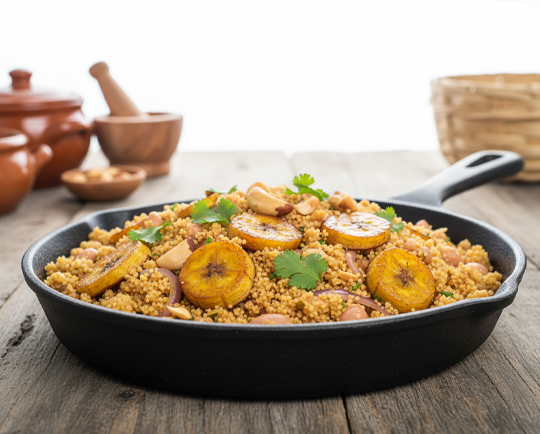 Prepare uma Farofa de Feijão Rosinha com Banana-da-Terra e Castanhas de dar água na boca. Uma criação culinária sofisticada, reconfortante e cheia de personalidade, com a crocância das castanhas, o sabor adocicado da banana e a textura marcante do feijão — perfeita para acompanhar refeições especiais e celebrar momentos memoráveis.