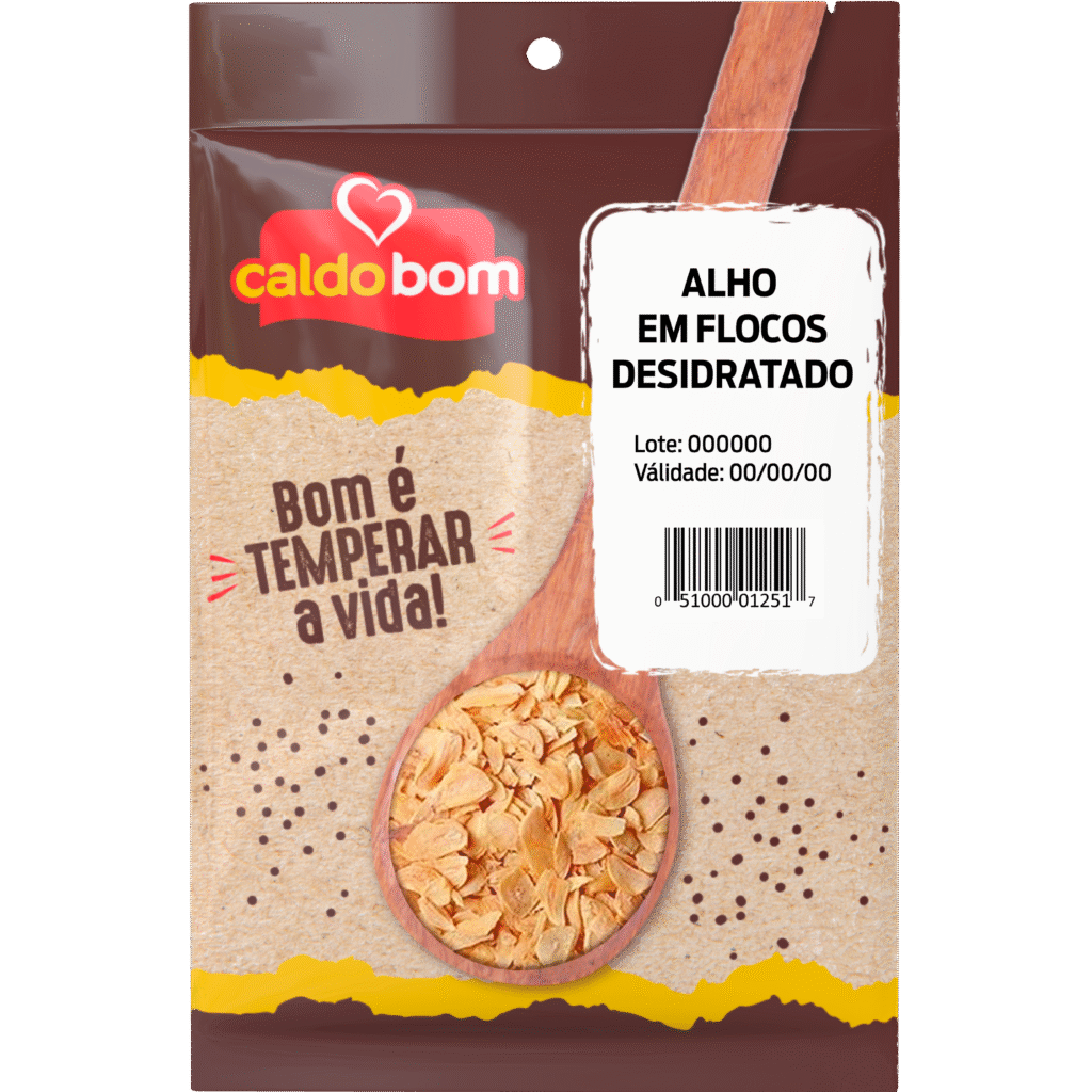 O Alho em Flocos Desidratado Caldo Bom é produzido a partir de alho selecionado, preservando sabor e praticidade.