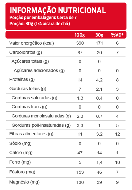 Alérgicos: Contém aveia. Pode conter derivados de trigo, leite, ovo e soja. Contém glúten.