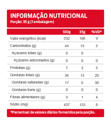 *As declarações de ingredientes, dados nutricionais e alergênicos podem mudar. Consulte sempre a embalagem real para obter as informações mais completas e precisas.