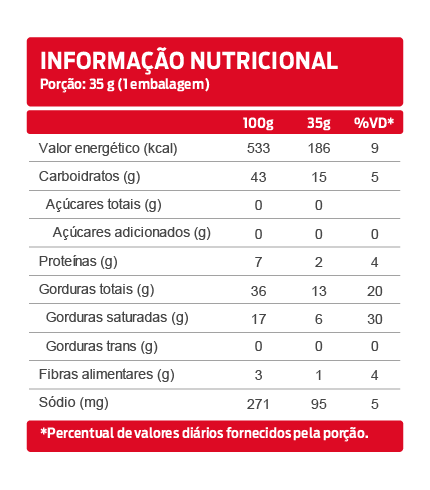 *As declarações de ingredientes, dados nutricionais e alergênicos podem mudar. Consulte sempre a embalagem real para obter as informações mais completas e precisas.