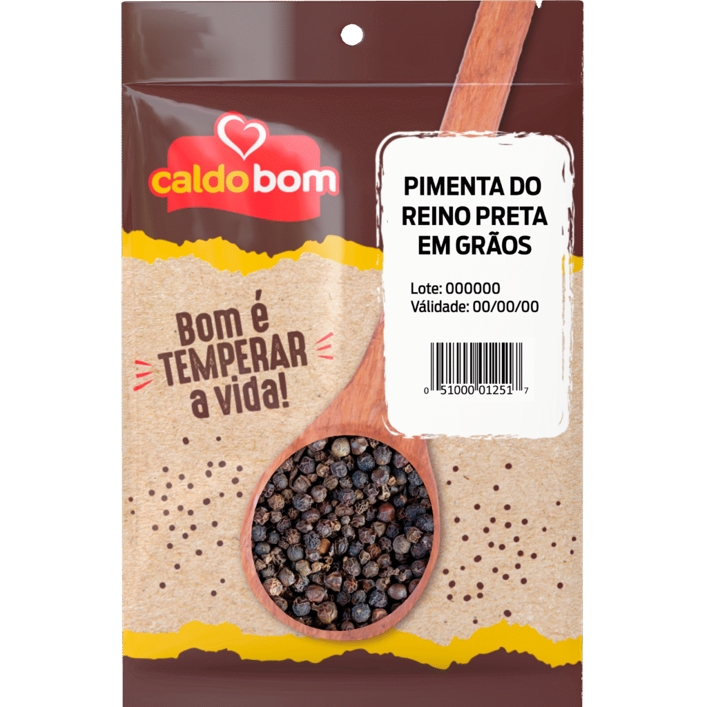 A Pimenta-do-Reino Preta em Grão Caldo Bom é de alta qualidade, com sabor intenso e aroma marcante.