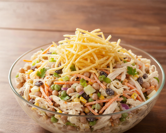 - 1. Em uma tigela grande, misture o frango desfiado, a cenoura, a maçã, a cebola, as uvas-passas, o milho, a ervilha e o Feijão Bolinha Caldo Bom.
